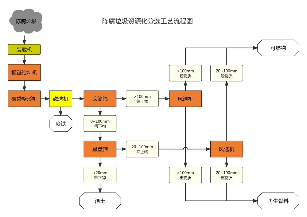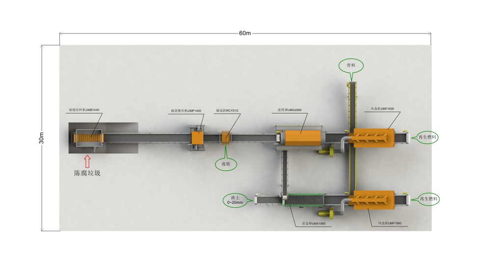 Обрабатываемым материалом являются выдержанные отходы полигонов захоронения, производительность переработки составляет 50~100 тонн/час выдержанных отходов, выдержанные отходы после прохождения через такие процессы, как дробление, сортировка и другие операции, разделяются на четыре типа материалов: вторичное топливо, щебень, металлолом, грунт: горючие материалы могут использоваться в качестве топлива для непосредственной отправки на электростанции или для производства RDF, металлолом может быть непосредственно реализован, щебень и грунт используются для обратной засыпки, таким образом достигается цель рециклинга, сокращения объема и обезвреживания выдержанных отходов.