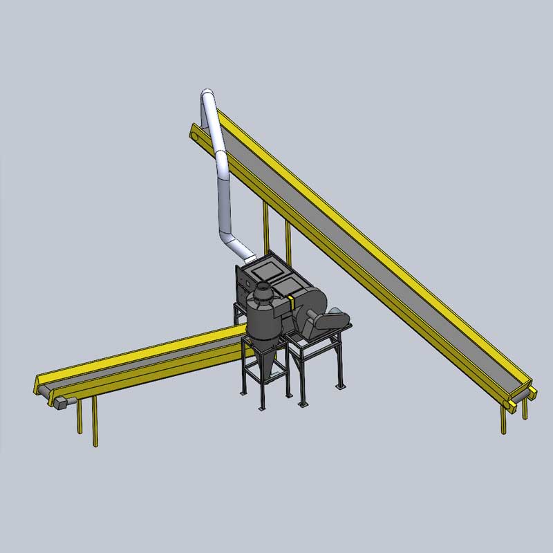 Основная конструкция включает: электродвигатель, интегрированный корпус, вращающееся сито, циклон, основной металлокаркас, вентилятор, воздуховоды, разгрузочный клапан и т.д. Основное назначение: обычно используется в качестве оборудования третьей стадии сортировки, всасывающее отверстие с отрицательным давлением отсасывает легкие фракции в зоне разгрузки, часть всасываемой пыли после обработки в циклоне попадает в нижний разгрузочный клапан и выводится приемным ленточным конвейером; легкие фракции попадают на вращающееся сито, вращение сита выносит легкие фракции, они попадают в разгрузочный клапан для выхода материала и выводятся через выходной ленточный конвейер в нижней части разгрузочного клапана. Таким образом достигается очистка пыльного материала, что обеспечивает удобство для последующей обработки материала. Размер тяжелых материалов, поступающих в оборудование, составляет ≤10 мм, размер легких материалов может быть увеличен, стандартная производительность составляет 20-30 тонн в час (в зависимости от насыпной плотности материала).