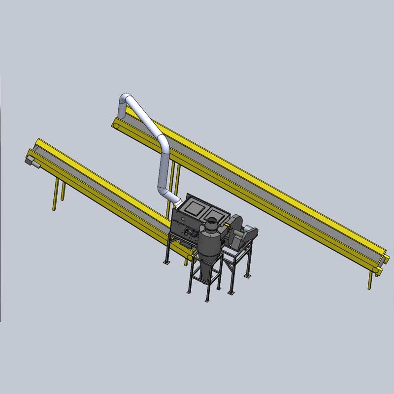 На основе примесей в виде пыльного материала размером менее 10 мм, в зоне разгрузки ленточного конвейера легкие примеси 2D отсасываются, тем самым повышается чистота пыльного материала.